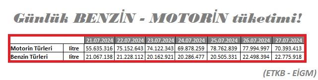 Resmi verilere göre (Enerji ve Tabi Kaynaklar Bakanlığı - EİGM), geçen hafta Türkiye akaryakıt tüketimi; heem benzinde ve hem de motorinde artış gösterdi. Ve günlük benzin tüketimi 20 milyon litrenin üzerine çıktı. Günlük motorin tüketimi de 78 milyon litreyi aştı.