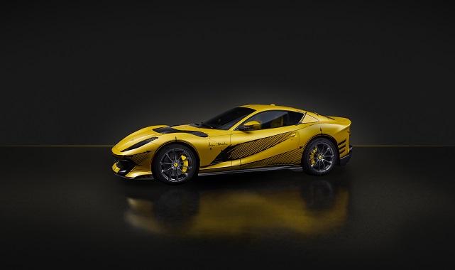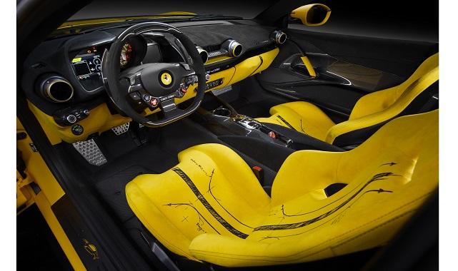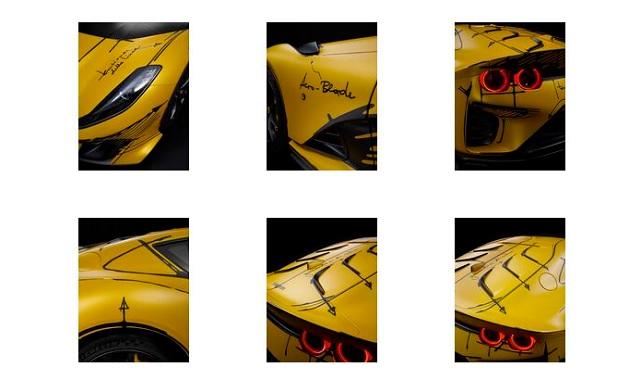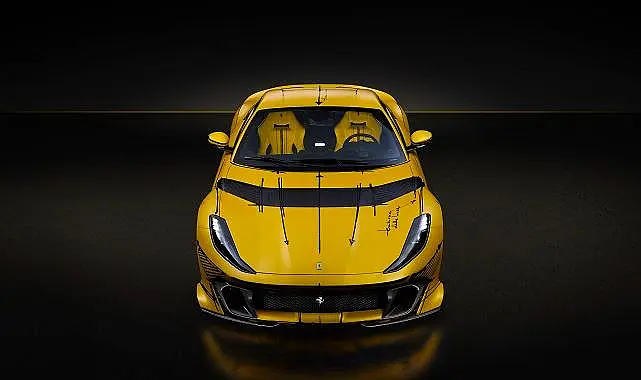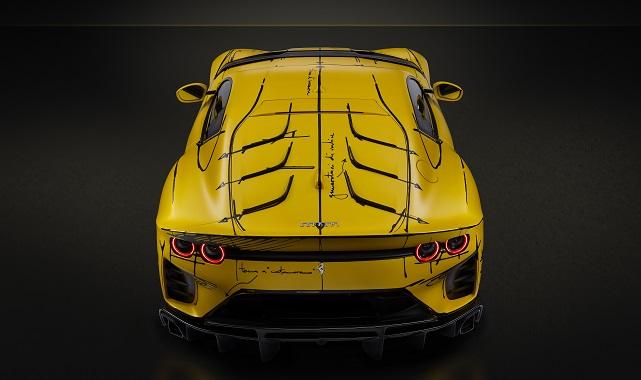 Otomobil aslında Maranello tasarımcılarının ilk fikirlerini, içgörülerini ve notlarını zihinlerinden kâğıda aktardıkları ikonik sarı kartlara benzemesi hayal edilerek tasarlandı. Üzerine detay üzerine detay, fikir ardına fikir eklenen ve sürekli yenilenen bu sarı kartlar, İtalyan otomotiv tasarım tarihinin bir parçası olacak yeni konseptlerin, eşsiz stilistik özelliklerin ve şekillerin oluşturulduğu kağıtlar olarak öneme sahip. Üç katmanlı, mat sarı renge sahip otomobilin üzerinde, ek olarak baş tasarımcının en ikonik öğelerinin izini süren mat siyah rengindeki eskiz uygulaması da eklendi.