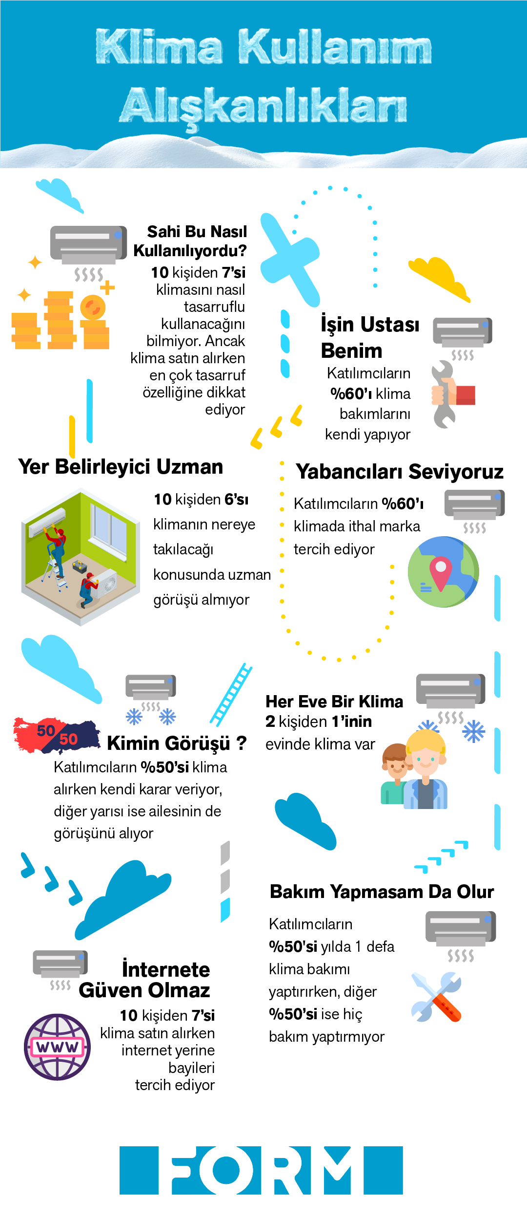 Enerji Ekonomisi - Duvar tipi klimalarda sektörün önemli oyuncularından Form MHI Klima Sistemleri, ‘Dünya Soğutma Günü’nde gerçekleştirdiği araştırma ile Türkiye’de klima kullanım alışkanlıklarını ortaya koydu. Form’un Instagram ve Facebook üzerinden gerçekleştirdiği sosyal medya anketinde toplam 12 soruya 30 bin 802 yanıt verildi.