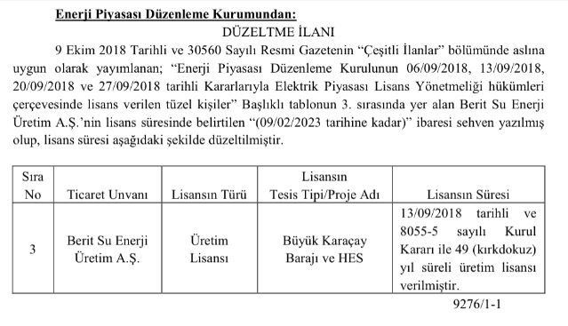 Enerji Piyasası Düzenleme Kurumu (EPDK)’nın düzeltme ilanını alapuda okutabilirsiniz.