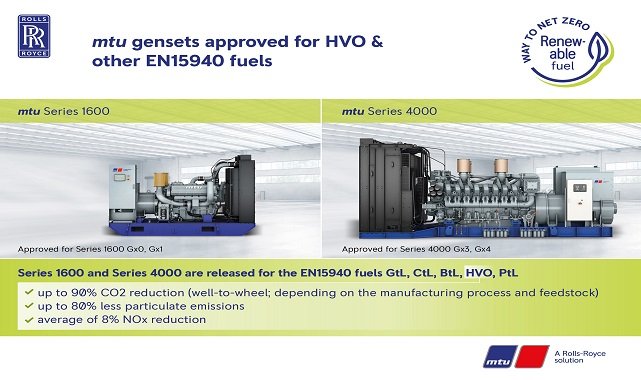 Rolls-Royce, elektrik üretiminde EN15940 sertifikalı sentetik dizel yakıtları kullanan 4000 Serisi ve 1600 Serisi dizel motorlarının geçen yıl belirlenen “net sıfır” hedeflerine ulaşması yolunda önemli bir adım attı. Saha testlerini de içeren bir dizi başarılı testin ardından her iki motor serisinde de “biokütleden üretilen sıvı yakıtlar (BtL - Biomass to Liquid)”, “hidro-işlem görmüş bitkisel yağlar (HVO - Hydrotreated Vegetable Oil)” ve e-dizel gibi “elektrikten üretilen sıvı (PtL - Power to Liquid) yakıtlar” dâhil olmak üzere pek çok sürdürülebilir yakıtın kullanılabildiği görüldü. Sayılan tüm sürdürülebilir yakıtlar geleneksel dizel yakıtın yerini alabilmektedir.