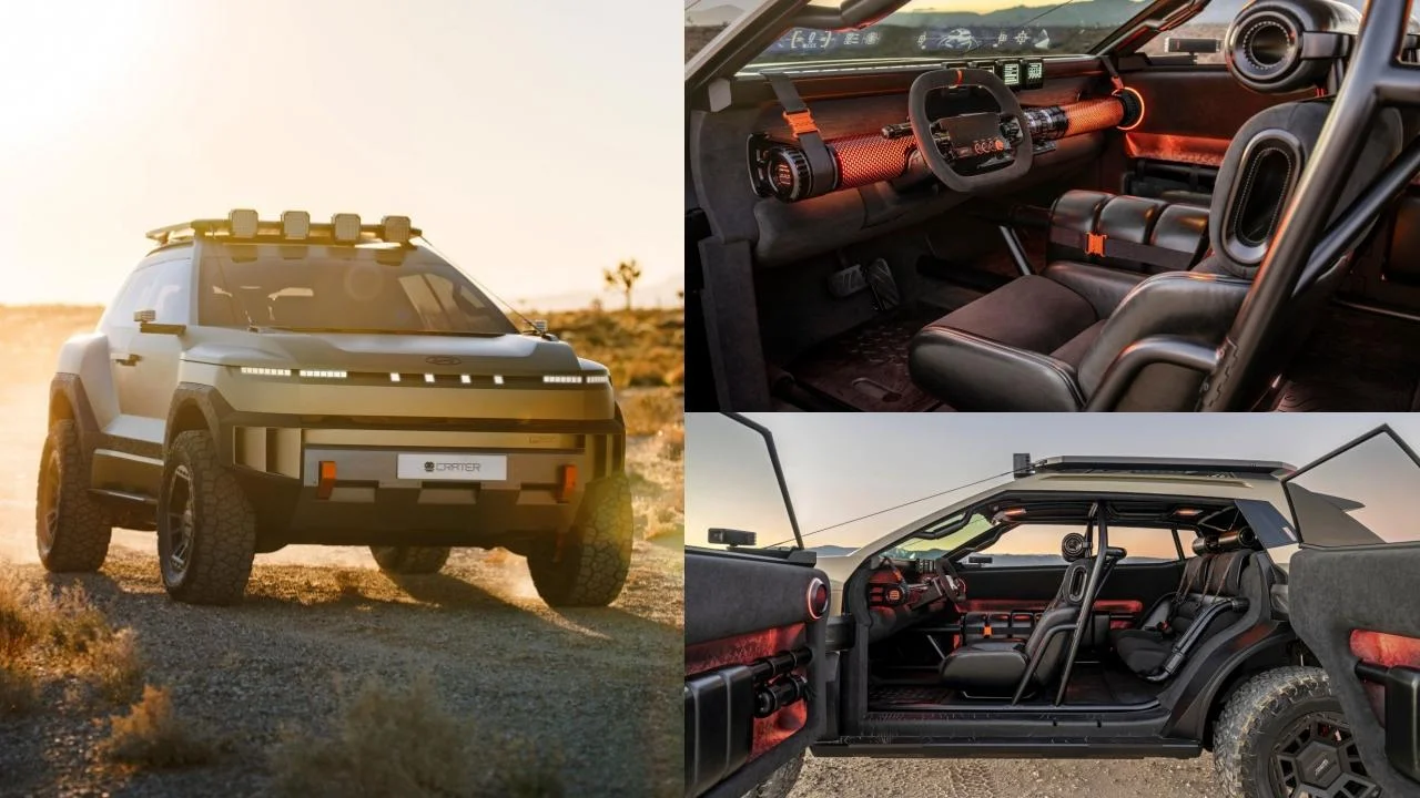 CRATER Concept’in iç tasarımı, teknolojiye meraklı ve maceracı kullanıcılar için fonksiyon odaklı olarak kurgulandı. Yumuşak ancak dayanıklı malzemeler, sert yapısal detaylarla bir araya getirilerek hem konfor hem de dayanıklılık sağlanıyor. Kabin içinde açıkta bırakılmış takla kafesi, bütünleşmiş tutma kolları ve dört noktalı emniyet kemeri gibi unsurlar güvenli keşif hissini güçlendiriyor.