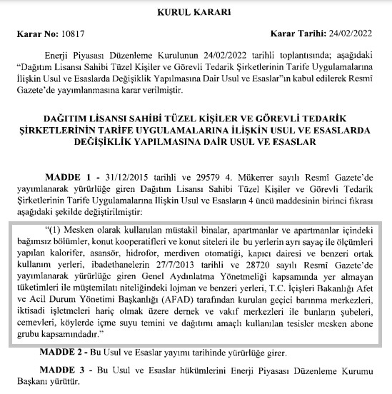 Enerji Piyasası Düzenleme Kurumu (EPDK)'nın konuyla ilgili kararı bugünkü Resmi Gazete de yayınlandı (1 Mart 2022 tarih ve 31765 sayılı Resmi Gazete).