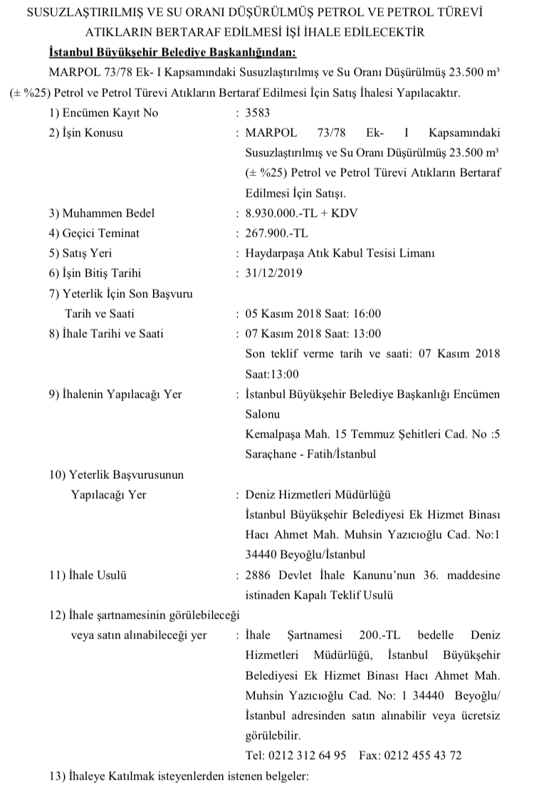 Resmi Gaxetede yayınlanan ihale duyurusu şöyle: