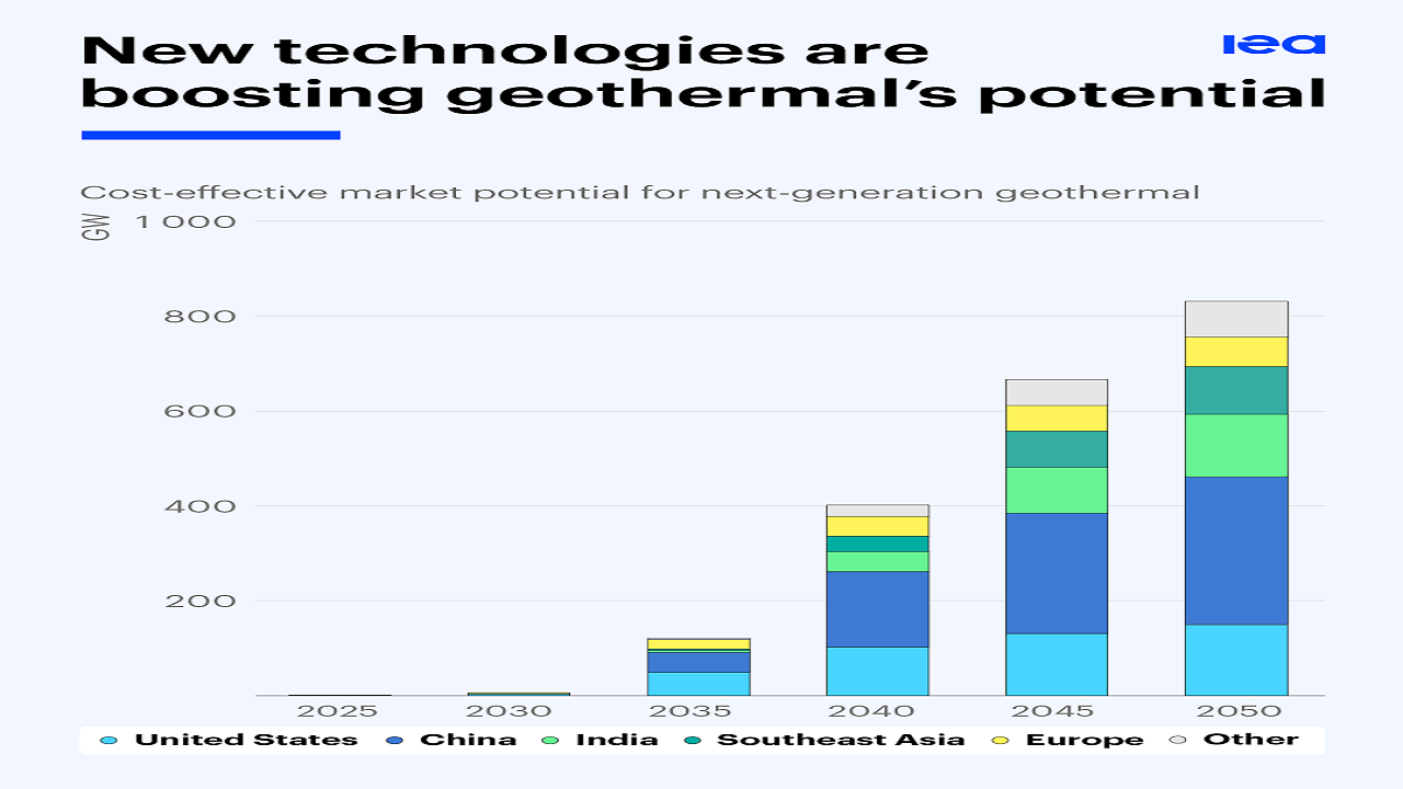 IEA... ''Jeotermal enerji şu anda küresel elektrik talebinin yaklaşık% 1'ini karşılamaktadır. Konvansiyonel jeotermal, kaynaklara erişimi kolaylaştıran volkanik aktiviteye sahip veya tektonik fay hatlarına sahip ülkelerde kurulu kapasitenin çoğuna sahip, konuma özgü, niş bir teknoloji olmaya devam etmektedir.