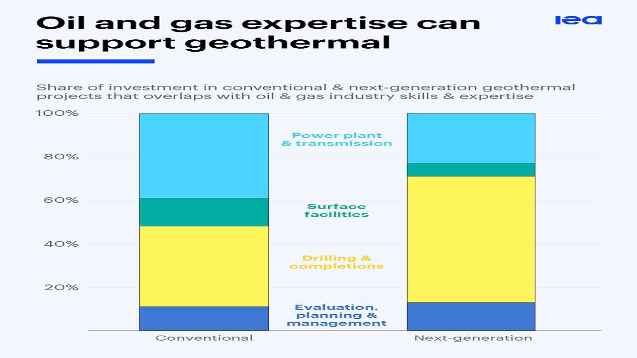 Ek olarak, petrol ve gaz endüstrisi jeotermalin daha rekabetçi hale getirilmesinde kilit bir rol oynayabilir. Birçok yeni nesil jeotermal teknolojisi, Kuzey Amerika'da sektör tarafından honlanmış yatay delme ve hidrolik kırma gibi teknikleri kullanıyor. Jeotermal için gereken yatırımın yüzde 80'ine kadarı, mevcut petrol ve gaz operasyonlarından aktarılabilecek kapasite ve becerileri içerir.''