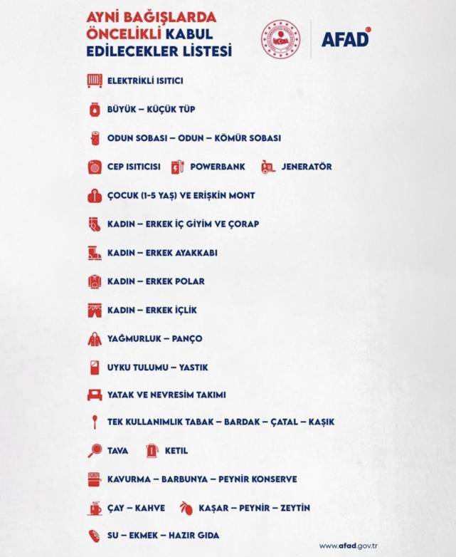 AFAD - Acil ihtiyaçlar:- Elektrikli ısıtıcı, Büyük-küçük tüp, odun sobası, odun - kömür sobası, cep ısıtıcısı, jeneratörler!