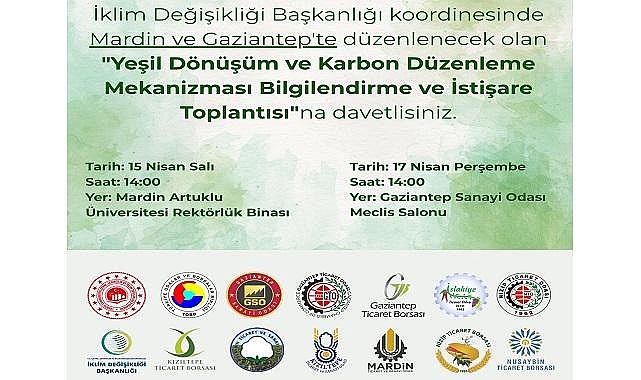- ''İklim Değişikliği Başkanlığı koordinesinde Mardin ve Gaziantep'te düzenlenecek olan "Yeşil Dönüşüm ve Karbon Düzenleme Mekanizması Bilgilendirme ve İstişare Toplantısı"na davetlisiniz.''