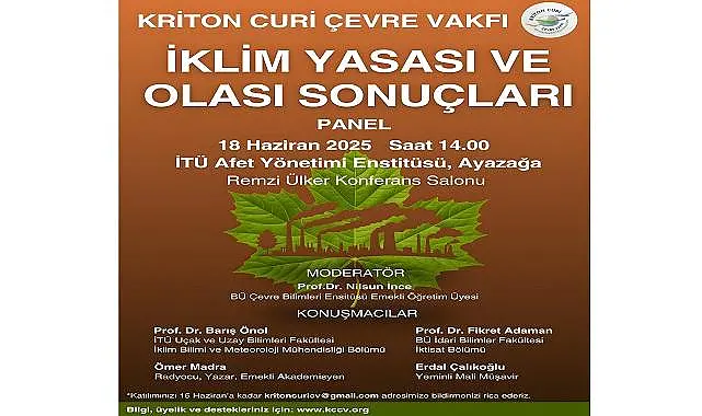 Kriton Curi Çevre Vakfı'nın düzenlediği "İklim Yasası ve Olası Sonuçları" paneli, 18 Haziran Çarşamba günü İstanbul Teknik Üniversitesi Afet Yönetimi Enstitüsü’nün Ayazağa’daki Remzi Ülker Konferans Salonu’nda gerçekleştirilecek.