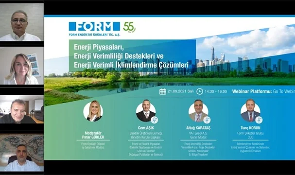 Form Şirketler Grubu Yürütme Kurulu Başkanı Tunç Korun, EUD Elektrik Üreticileri Derneği Başkanı Cem Aşık ve VAT Enerji A.Ş Genel Müdürü Altuğ Karataş’ın konuşmacı olarak yer aldığı, Form Endüstri Ürünleri İş Geliştirme Müdürü Pınar Gürler’in moderatörlüğünü üstlendiği “Enerji Piyasaları, Enerji Verimliliği Destekleri ve Enerji Verimli İklimlendirme Çözümleri” konulu webinarda iklimlendirme ve enerji sektörüne dair önemli bilgiler paylaşıldı.