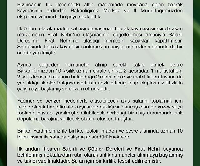 Çevre, Şehircilik ve İklim Değişikliği Bakanlığı, ''Erzincan’ın İliç İlçesinde Yaşanan Maden Kazası' konulu yeni açıklama yaptı. Bakanlık açıklaması tam metnini aşağıda okuyabilirsiniz.
