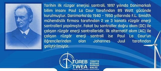 ''Tarihin ilk rüzgar enerjisi santrali (RES), 1897 yılında Danimarkalı bilim insanı Paul La Cour tarafından 89 Watt gücünde kurulmuştur. Danimarka'da 1940-1950 yıllarında F.L. Smidth mühendislik firması tarafından 2 ve 3 kanatlı rüzgâr enerji santralleri yapılmıştır. Fakat bu santraller doğru akım (DC) ile çalışan rüzgâr enerji santralleridir. İlk alternatif akim (AC) ile çalışan rüzgâr enerji santrali ise Paul La Cour'un öğrencilerinden olan Johannes Juul tarafından geliştirilmiştir.''