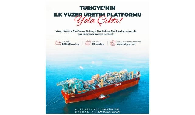 Enerji Bakanı Alparslan Bayraktar, paylaşım yaptı: Yüzer üretim platformumuz Singapur’dan Türkiye’ye doğru yola çıktı. Yaklaşık 2 aylık seyir süresinin ardından ülkemize ulaşacak. Adeta yüzen bir sanayi tesisi olan bu devasa deniz üssü ile her gün 5 milyon hanenin ihtiyacını karşılayacak kadar doğal gaz üretimi yapacağız. Yolu açık, pruvası neta olsun.