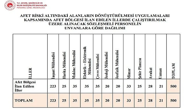 AFET RİSKİ ALTINDAKİ ALANLARIN DÖNÜŞTÜRÜLMESİ UYGULAMALARI KAPSAMINDA AFET BÖLGESİ İLAN EDİLEN İLLERDE ÇALIŞTIRILMAK ÜZERE SÖZLEŞMELİ PERSONEL ALIM İLANI