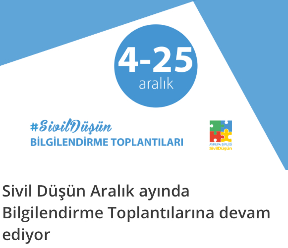 Sivil Düşün Bilgilendirme Toplantıları Devam Ediyor. Avrupa Birliği Sivil Düşün Programı, 4-25 Aralık tarihleri arasında farklı şehirlerde düzenlenecek Bilgilendirme Toplantılarında yeni dönem destekleriyle ilgili güncel gelişmeleri katılımcılarla paylaşacak.