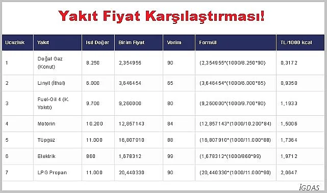 İstanbul'un doğal gaz dağıtım şirketi İGDAŞ, ısınmak için en ucuz yakıtı hesapladı. İGDAŞ'ın hesaplamasına göre doğal gaz ısınmak için en ucuz yakıt olurken LPG (Likit Petrol Gazı) propan en pahalı yakıt oldu (Eylül 2022 hesaplaması).