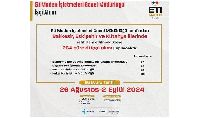 ETİ Maden, 264 kişilik işçi alımı için duyuru yaptı. İŞKUR, ETİ Maden işçi alımı için son başvuru tarihinin ise 2 Eylül olduğuna vurgu yaptı.