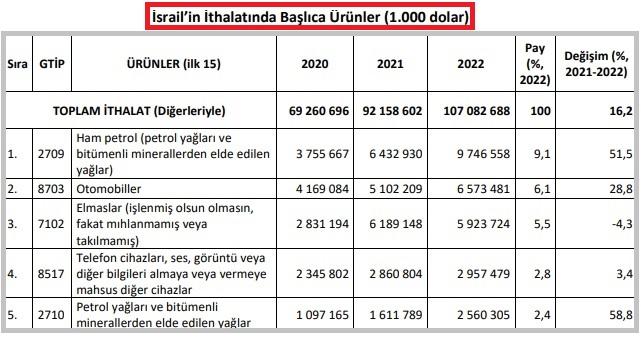 İsrail, ticarette dünyaya muhtaç bir ülke. İhtiyaçlarının büyük bir bölümünü ithalat yoluyla karşılıyor. İsrail'in ithalatında ilk sırada ise, stratejik bir ürün olan petrol yer alıyor.