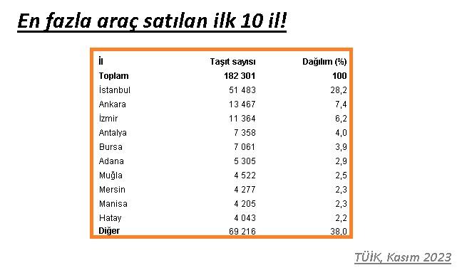 TÜİK verilerine göre, illere göre araç satışlarında (trafiğe kaydı yapılan araç sayısı); metrepol şehir istanbul 1. sırafa yer adlı. İstanbul'ı 2. sırada Ankara ev 3. sırada da İzmir izledi. Türkiye'de en çok araç satılan ilk 10 sıralamasında ise büyük deprem felaketinin yaşandığı Hatay 10. sırada yer aldı. illere göre araç satışları sıralaması için aşağıdaki tabloya bakınız.