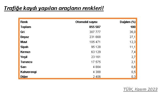 TÜİK verilerine göre trafiğe kaydı yapılan otomobillede (araç) renk sıralamasında (Kasım 2023), gri birinci sırada, beyaz ikinci sırada ve mavi üçüncü sırada yer aldı. Renklerine göre araç sıralaması için aşağıdaki tabloya bakınız.