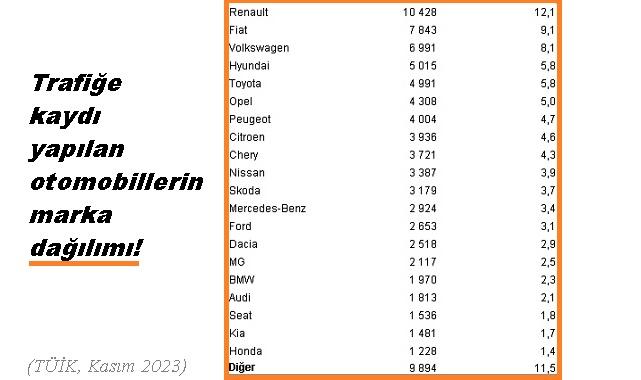 - (Trafiğe kaydı yapılan otomobillerin marka dağılımı - Kasım 2023
