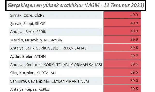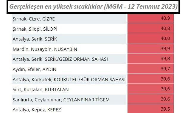 Meteoroloji MGM), gerçekleşen (ölçülen) en yüksek sıcaklıkları açıkladı. 12 Temmuz Çarşamba günü Türkiye'de en yüksek sıcaklık 40,9 derece ile Şırnak - Cizre'de gerçekleşti. İkinci en yüksek sıcaklık ölçümü yine Şırnak Silopi'de 40,8 derece ile ölçüldü. Üçüncü en yüksek sıcaklık ise Antalya Serik'te 40,0 derece ile ölçüldü.