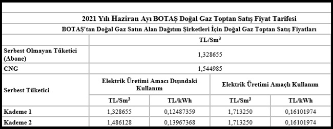 BOTAŞ, Haziran - Temmuz dönemi doğal gaz fiyatları ayrıntıları için aşağıdaki tablolara bakınız.