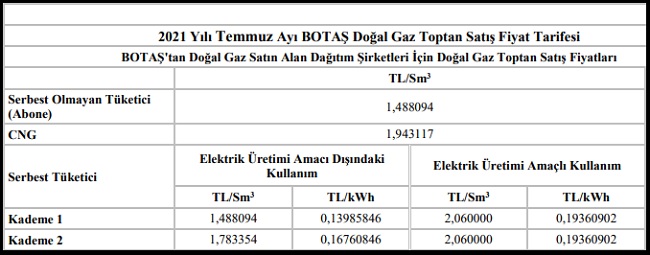 1 Temmuz 2021 tarihinden itibaren geçerli olmak üzere doğal gaz fiyatlarına, zam geldi. Kamu şirketi BOTAŞ (Boru Hatları ile Petrol Taşıma AŞ), yeni fiyatları resmi internet sitesi üzerinden duyurdu. BOTAŞ'ın yayınladığı yeni tariffelere göre konutlar için 1 metreküp doğal gazın fiyatı 1,328655 liradan 1,488094 liraya yükseldi.