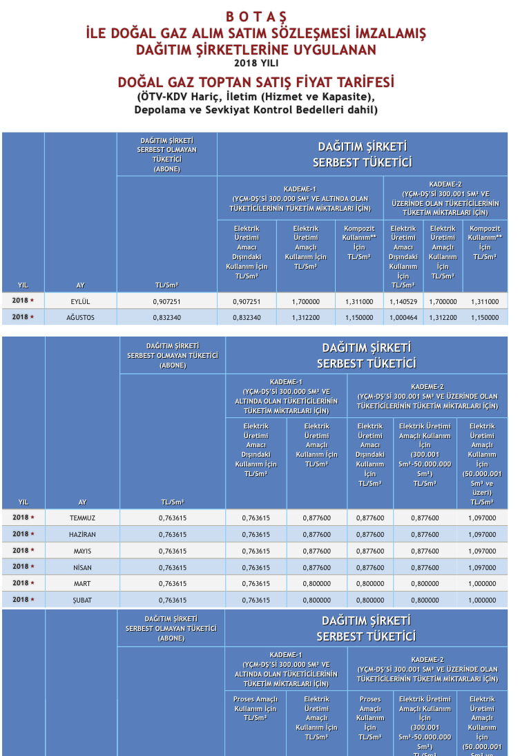 Doğalgaz 1 Eylül 2018 tarihi itibariyle zam geldi. Kamu şirketi Boru Hatları ile Petrol Taşıma AŞ (BOTAŞ)’ın yeni düzenlemesiyle Konut ve sanayiye yüzde 9-14 aradı artan fiyatlar sonrası oluşan yeni fiyatları aşağıda okuyabilirsiniz.
