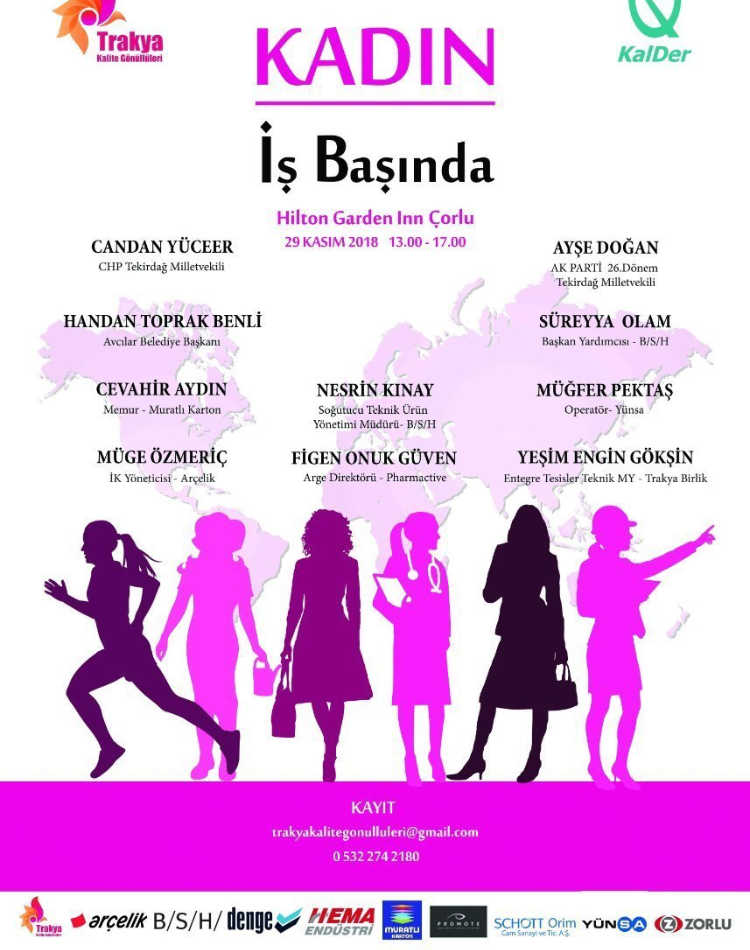 KalDer ve Trakya Kalite Gönüllüleri işbirliğiyle düzenlenen 'Kadın İş Başında' Konferansı 29 Kasım'da Hilton Garden Inn Çorlu'da! KalDer Yönetim Kurulu Başkanı Buket Eminoğlu'nun açılış konuşmasını yapacağı konferans, mesleğinde fark yaratmış kadınları bir araya getirecek.