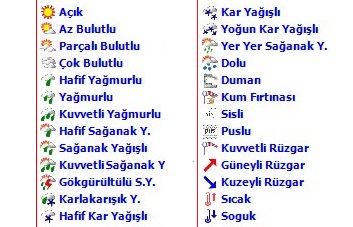 Açık hava, kuvvetli yağış ya da fırtına. Kuvvetli kar yağışı ya da don. Meteorolojik hava tahmin simgeleri ve anlamları.