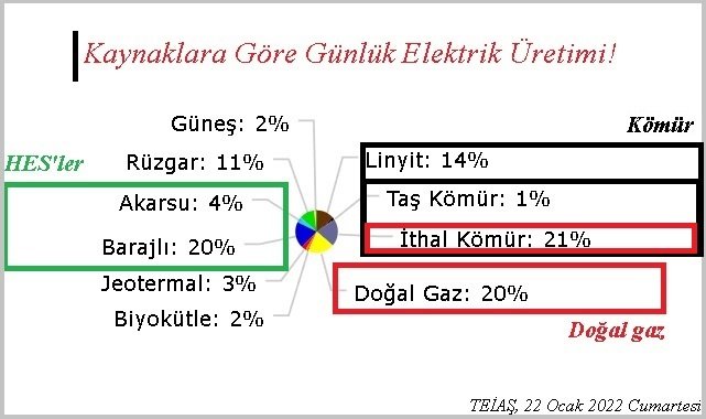 Günlük elektrik üretiminde HES'ler (Hidroelektrik santraller) ilk sıraya yükseldi. 22 Ocak Cumartesi günü (dün), Türkiye'de en fazla elektrik barajlarda (Akarsu HES, Barajlı HES) üretildi.