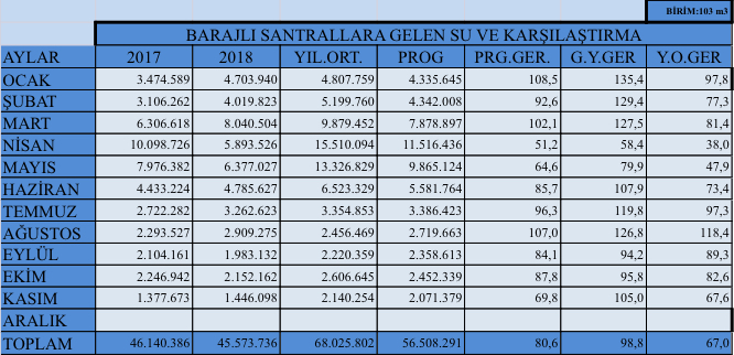 Türkiye Elektrik İletim AŞ (TEİAŞ)’ın verilerine göre bu yıl 20 Kasım itibariyle barajlara gelen su miktarı yaklaşık 1,0 milyar metreküp iyileşmeş (Ayrıntılar için tabloya bakınız) var. Fakat rakam, yıl ortalamasın gerisinde. Havalarda sıcak gidiyor. Bu demektir ki, su miktarında dikkat çekici bir durum var (Su gelirleri açısından). Bugün için bir sorun yaşanmıyor olabilir. Fakar, yaz başları yani Nisan’da barajlara kar suları gelmeye başlamaz ise bir diğer ifade ile barajların doluluk oranı düşük kalırsa bu yaz dönemi için; elektrik üretimi, içme ve sulama suları açısından risk var demektir.