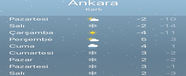 Kar yağışının hafta içi de süreceği tahmin ediliyor. Meteorolijik tahminlere göre Ankara haftaiçi kar yağışlı günler çoğunlukta olacak.