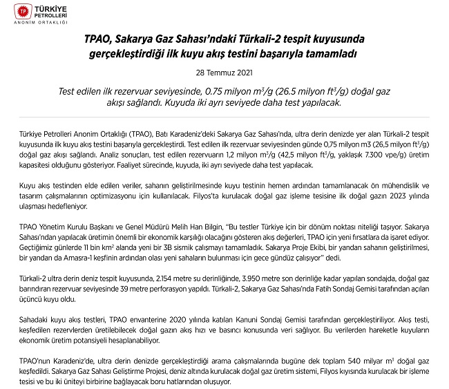 -'Keşfin Ateşi Karadeniz'den Yükseliyor. Sakarya Gaz Sahası'ndaki Türkali-2 tespit kuyusunda gerçekleştirdiğimiz ilk kuyu akış testini başarıyla tamamladık.'AYRINTILAR!