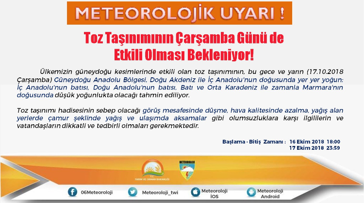 Meteoroloji Genel Müdürlüğü (MGM), sosyal medya üzerinden önemli bir uyarı yaptı: Meteorolojik Uyarı. Toz Taşınımının Çarşamba Günü de Etkili Olması Bekleniyor.