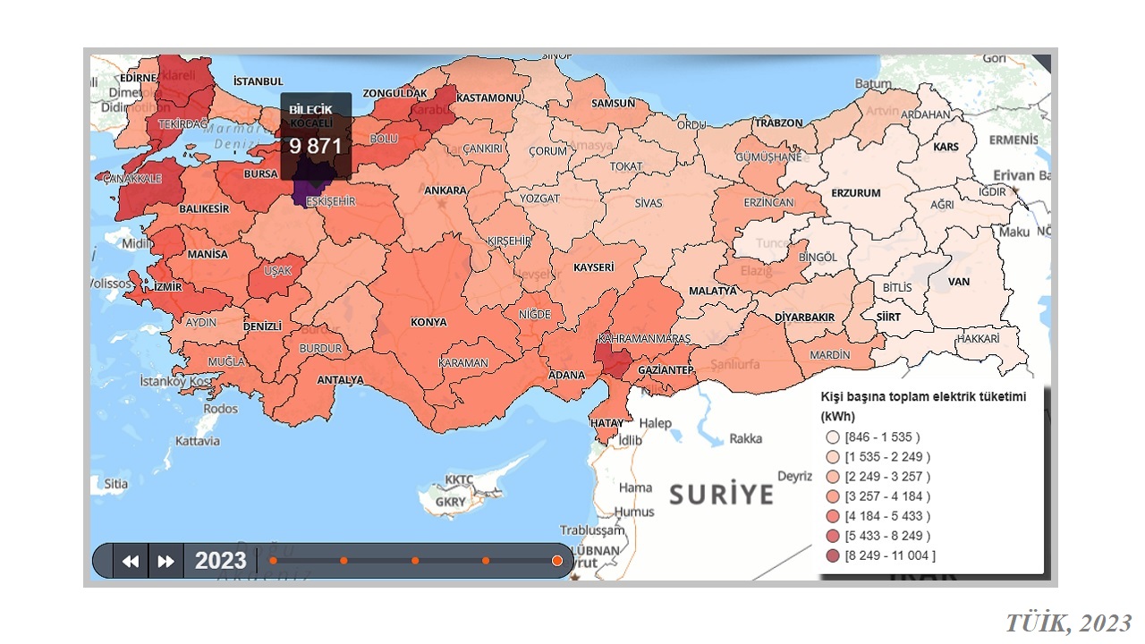 Kaynak: TÜİK (Türkiye İstatistik Kurumu). 2023 Yılı Türkiye Kişi Başı Elektrik Tüketim Verileri.