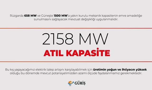 Türkiye'nin önemli rüzgar yatırımcılarından GÜRİŞ'te, bu konuda önemli bir çağrı yaptı. GÜRİŞ'in, konuyla ilgili sosyal medya üzerinden yaptığı bilgi paylaşımı şöyle: 'Rüzgarda 658 MW ve Güneşte 1.500 MW’a yakın kurulu mekanik kapasitenin emre amadeliğe sunulmasını sağlayacak mevzuat değişikliği uygulanmalıdır.Bu kış yaşayacağımız elektrik talep artışını karşılayabilmek için üretimin yoğun ve ihtiyacın yüksek olduğu bu dönemde mevcut potansiyelimizden azami ölçüde faydalanmamız gerekmektedir.'