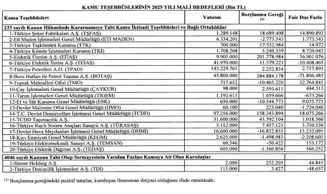 - Kam Enerji Şirketlerinin (KİT) yatırım, borçlanma faiz dışı fazla hedefleri