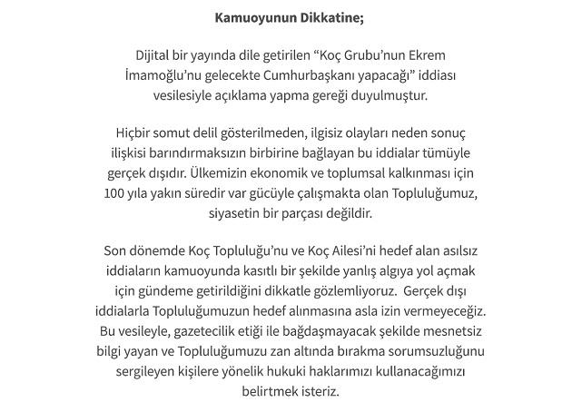 Koç Holding açıklaması - ''Son dönemde Koç Topluluğu ve Koç Ailesi'ne yönelik...''
