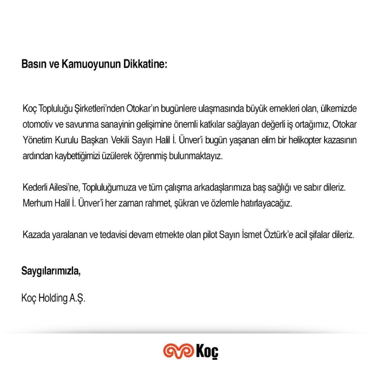 Koç Holding, üzücü helikopter kazasıyla ilgili taziye yayınladı: