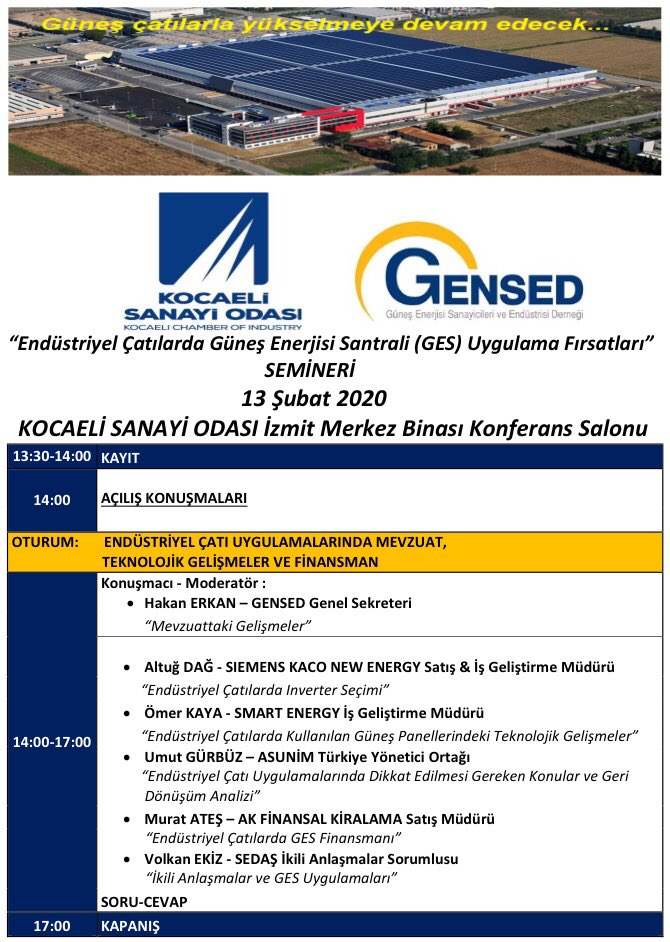 Güneş Enerjisi Sanayicileri ve Endüstrisi Derneği (GENSED)'in konuyla ilgili bilgi paylaşımı şöyle: OSB'lerde lisanssız çatı uygulamalarında,sorunlarla ilgili kamuda yapılan çalışmalar ve son kaynak tedarik tarifesiyle ilgili düzenlemeleri @kocaeliso 'nda konuşacağımız 'Endüstriyel Çatılarda GES Uygulama Fırsatları'seminerimize tüm #güneş dostlarını bekleriz.