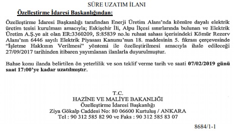 Özelleştirme İdaresi Başkanlığı (ÖİB), Eskişehir'deki Kömür Enerji Üretim Alanı ihalesi süresini 2 Şubat 2019 tarihine uzattı. Resmi Gazetede yayınlanan duyuruyu aşağıda okuyabilirsiniz.