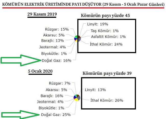 Aynı tarihlerde kömürle elektrik üretimi düşerken, doğal gazla elektrik üretimi de artışa geçti. 29 Kasım pazar günü Türkiye toplam elektrik üretiminde doğal gazın payı yüzde 16 iken bu rakam 5 Ocak pazar günü yüzde 25'e çıktı.