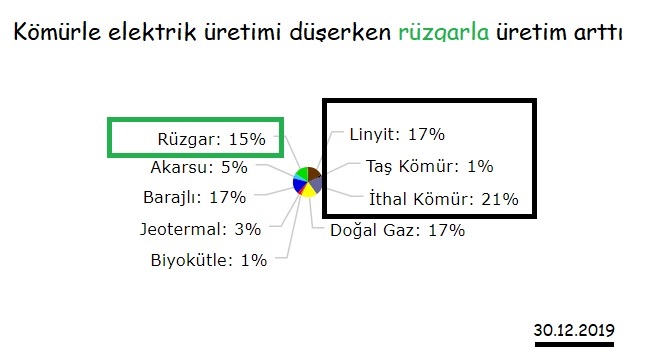 Türkiye Elektrik İletim AŞ (TEİAŞ) Yük Tevzi Bilgi Sistemi (YTB) verilerine göre dün (30 Aralık 2019), Türkiye toplam elektrik üretiminde kömürün payı yüzde 39 oldu. Son günlerde bu rakam yüzde 50'ler civarında idi. Aynı gün rüzgar enerjisinde de yüksek üretim rakamı yakalandı. Rüzgarın Türkiye toplam elektrik üretimindeki payı yüzde 15 oldu. Rüzgarla elektrik üretimindeki artışa, son günlerde ülke genelindeki şiddetli rüzgar-fırtına da etkili oldu.