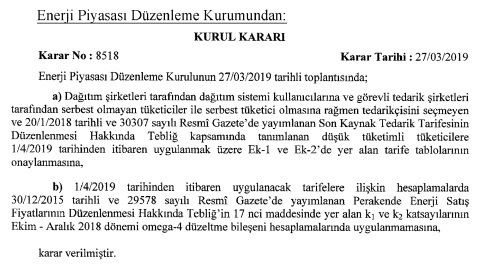 Enerji Piyasası Düzenleme Kurulunun 27/03/2019 Tarihli ve 8518 Sayılı Kararı: