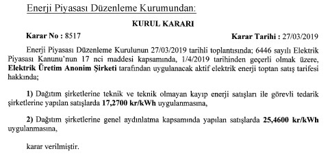 Enerji Piyasası Düzenleme Kurulunun 27/03/2019 Tarihli ve 8517 Sayılı Kararı: