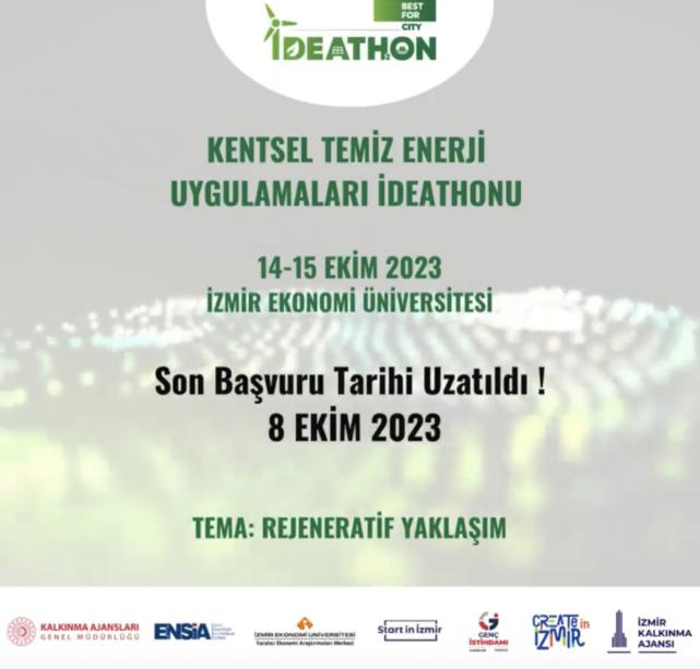 Bilgi paylaşımı şöyle: "İzmir Kalkınma Ajansı, İzmir Ekonomi Üniversitesi , IEU KREA, Creative Economy Reseach Centre at IEU ve Enerji Sanayicileri & İş İnsanları Derneği – ENSİA işbirliğiyle düzenlenen Best For City İdeathonu'na başvurular 8 Ekim 2023 tarihine kadar uzatıldı.