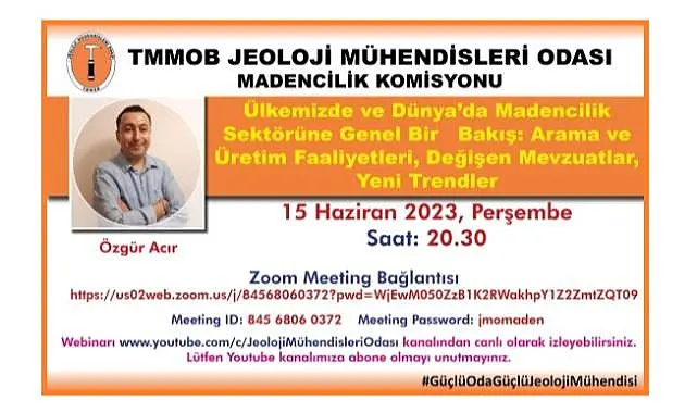 Jeoloji Mühendisleri Odası, bilgi paylaşımı yaptı... ''Madencilik Komisyonumuz tarafından 15 Haziran Perşembe günü saat:20.30’da Özgür ACIR`ın sunacağı ``Ülkemizde ve Dünya’da Madencilik Sektörüne Genel Bir Bakış: Arama ve Üretim Faaliyetleri, Değişen Mevzuatlar, Yeni Trendler`` başlıklı webinar yapılacaktır.'