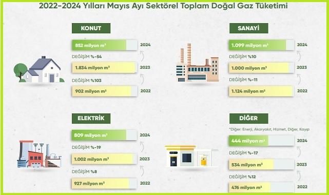 GAZBİR'in raporuna göre (Mayıs ayı); 2023 yılında 1,8 milyar metreküp olan doğal gaz tketimi, bu yılın mayıs ayında yüzde 54 düşüşle 852 milyon metreküp oldu.
